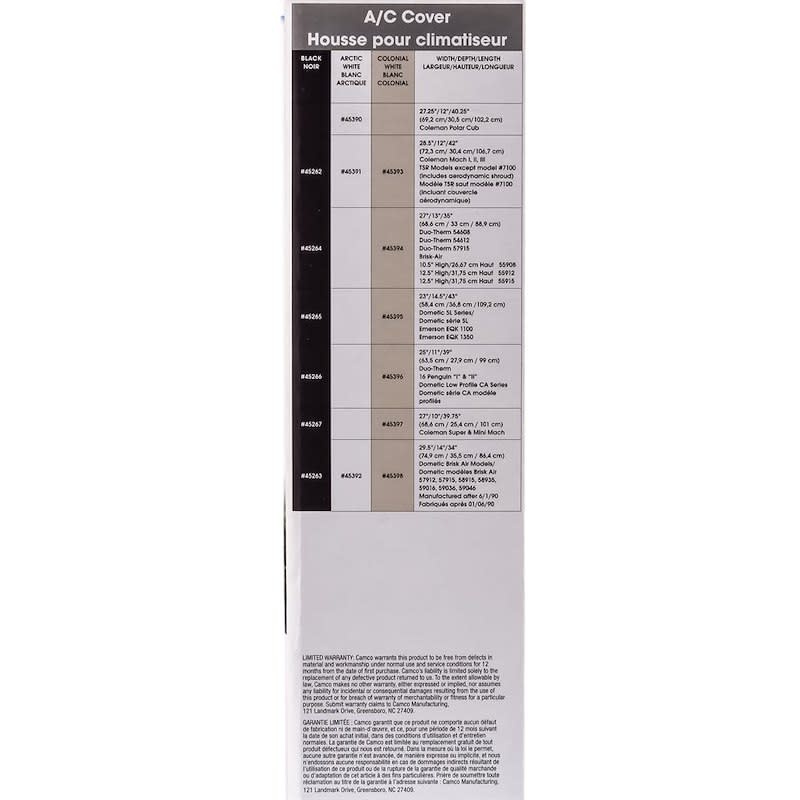 Camco Arctic White RV Vinyl Air Conditioner Cover protects your RV air conditioner from dirt, leaves and weather. Locking draw cord ensures a perfect fit. Helps keep out cold drafts. Fits Domestic Brisk Air Models.