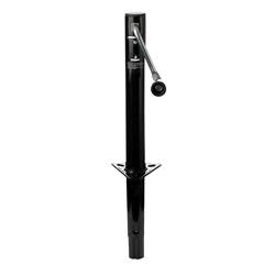 Trailer Tongue Jack; Manual Side Wind; Round A Frame Jack; 1000 Tongue Weight Capacity; 14-13/16 Inch Travel; Retracts To 8-7/8 Inches; 2 Inch Outside Tube Diameter; Bolt-On or Weld-On Mount; Painted Black Outer/ Black Inner Tube; Retail Packaging