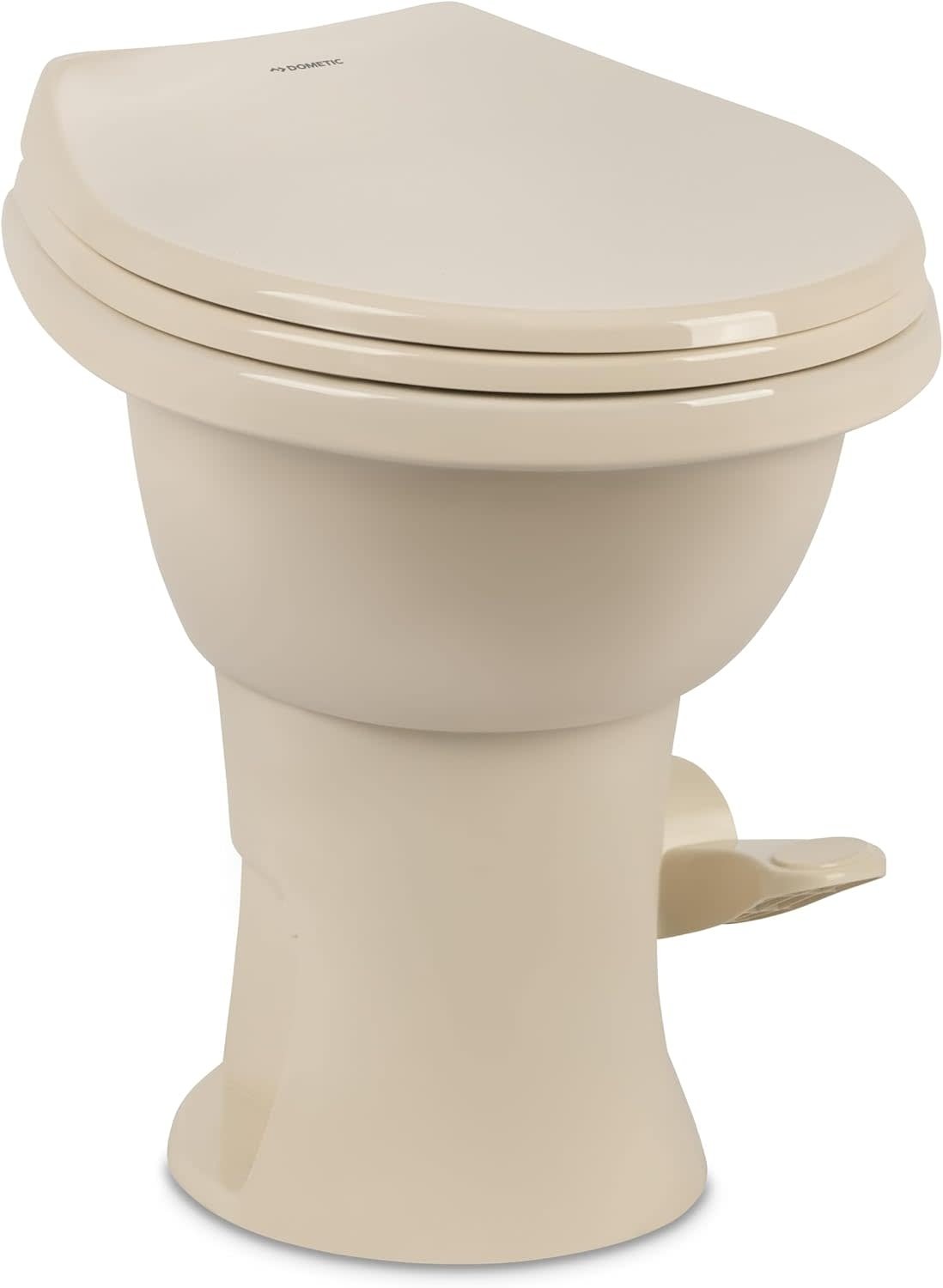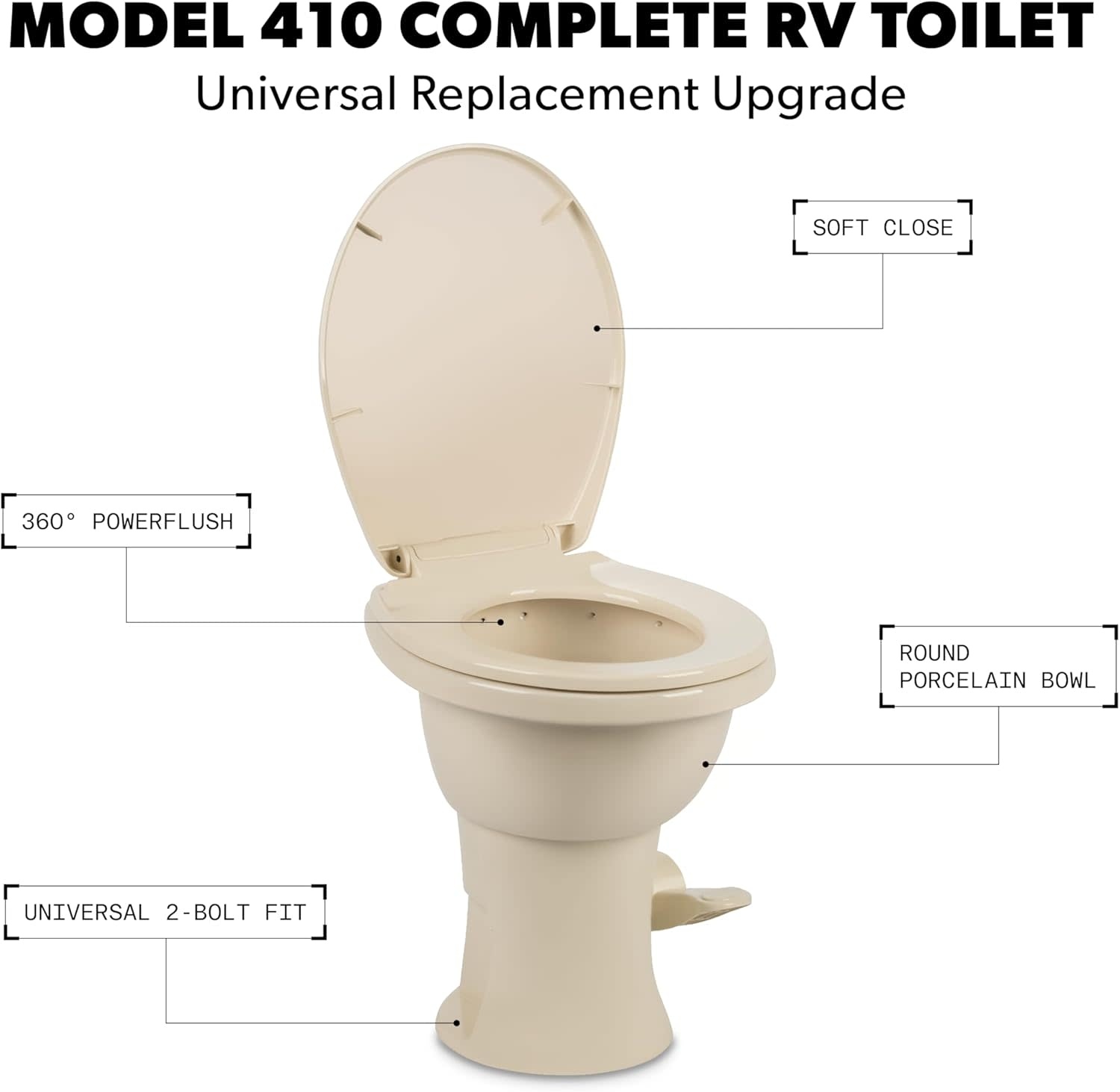 Toilet; 410 Series; Standard Profile; 18 Inch Seat Height; Slow Close Round Seat; Porcelain Bowl; Pedal Flush Control; 360 Degree Powerflush; 0.13 Gallon/ 0.5 Liter Water Usage Per Flush; Bone; 19-5/8 Inch Height x 15 Inch Width x 17-5/8 Inch Depth;
